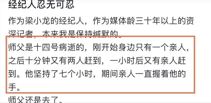 经纪人同时还透露,如果不是一些人为了博眼球和热度,直接将梁小龙去世的消息提前曝光,家人希望是他能够安安静静地离开的。