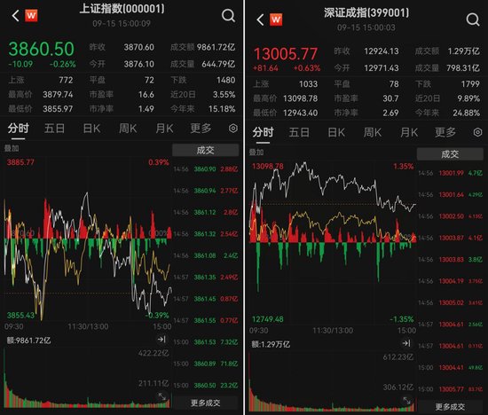 9月15日,A股三大股指数悉数高开后走势出现分化,早盘创业板指盘中站上3100点。午后三大指数均有所回调,截至收盘沪指小幅收跌,深证成指和创业板指则收红。